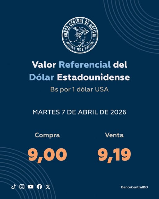 El Banco Central de Bolivia (BCB) ratificó este martes el valor referencial del dólar estadounidense y reportó que la divisa está a Bs 9 para la compra y a Bs 9,19 para la venta.