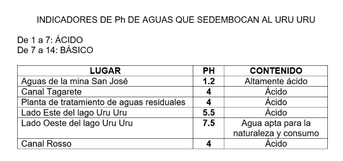 La primera muestra tomada en el sector Este, sobre la calle Santa Bárbara, presenta un nivel de PH 4, indicador que establece que las aguas de esa zona contienen una carga ácida altamente contaminante; por lo tanto, no es apta para el consumo humano.