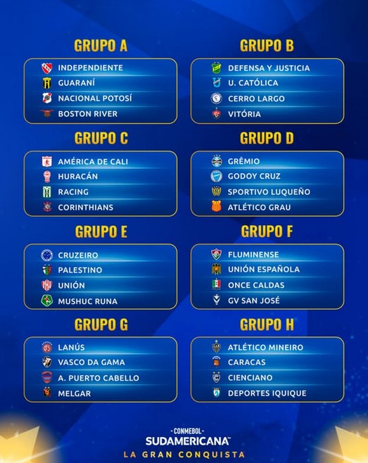 La CONMEBOL Sudamericana cuenta con 32 equipos participantes, que se dividen en 8 grupos de 4 clubes, de los cuales, los ganadores de cada grupo avanzaran directamente a la instancia de Octavos de Final.