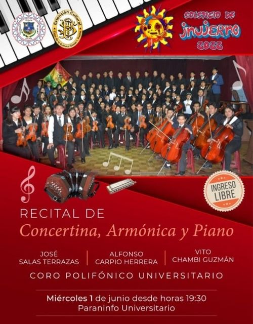Pero todo iniciará esta noche con el concierto del Coro Universitario y la Orquesta Filarmónica de Oruro, bajo la dirección de Vito Chambi, quien también estará acompañado por el connotado músico orureño José Salas y Alfonso Carpio, todo en el Paraninfo Universitario a partir de las 19:00 horas.