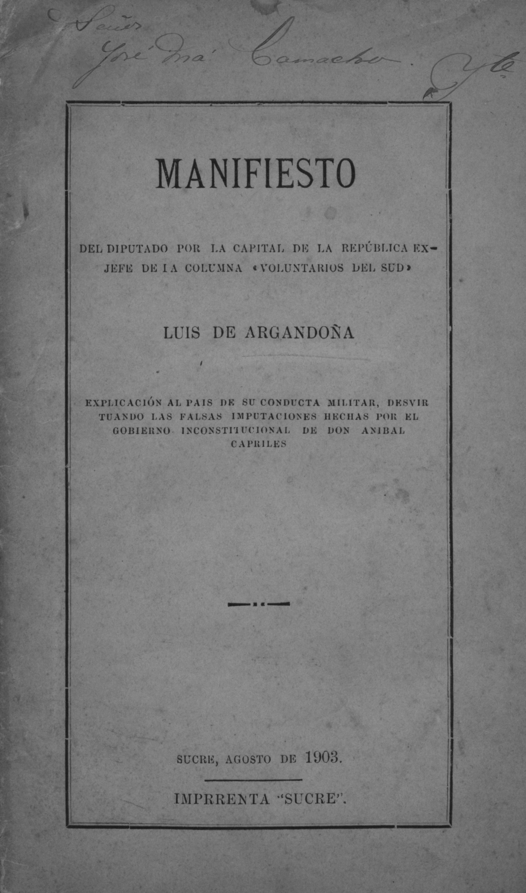 Sin embargo, encontramos un documento bajo el título de “Manifiesto” por Luis de Argandoña como diputado de la República y Jefe de la Columna “Voluntarios del Sud”, entendiendo que se organizó precisamente para acudir al llamado del país en la defensa de la soberanía en el territorio alejado del Acre. Este documento fue publicado en la ciudad de Sucre en 1903 y además tiene una recopilación de notas y documentos.