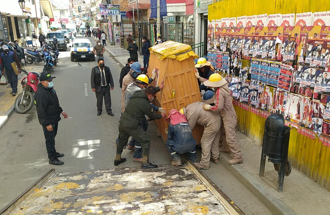 Con el objetivo de otorgar seguridad a los ciudadanos y evitar accidentes de tránsito, el director de Tráfico y Vialidad del Gobierno Autónomo Municipal de Oruro (GAMO), sargento primero Jaime Clavijo, junto al personal operativo, la tarde de este martes, procedió al retiro de una caseta de dulces que obstaculizaba la circulación de peatones. Las labores se efectuaron con la ayuda de equipo pesado del Municipio.