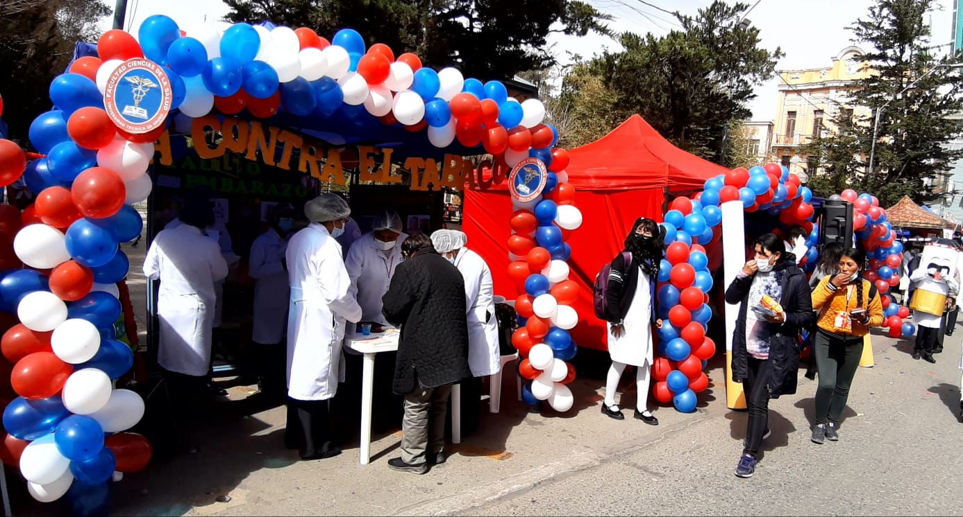 Este martes frente al edificio de la Gobernación, 240 estudiantes de la Universidad Técnica de Oruro (UTO) realizaron una feria informativa sobre los efectos del humo del tabaco.