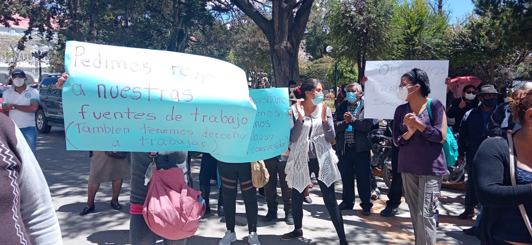 Un grupo numeroso de personas llegaron a puertas del edificio del Gobierno Autónomo Municipal de Oruro (GAMO), para exigir que se les permita abrir sus negocios, entre bares, quintas y otros, arguyendo que Defensa al Consumidor no realiza un control igualitario, permitiendo a varios locales clandestinos seguir con sus servicios, sin castigo alguno.