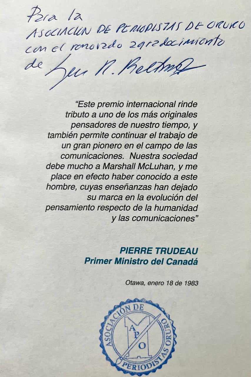 La Asociación de Periodistas de Oruro (APO), institución con casi un siglo de historia en el periodismo orureño y boliviano, preserva en su biblioteca un libro titulado Memoria de una Victoria, dedicado amablemente por nuestro galardonado con el Premio McLuhan.