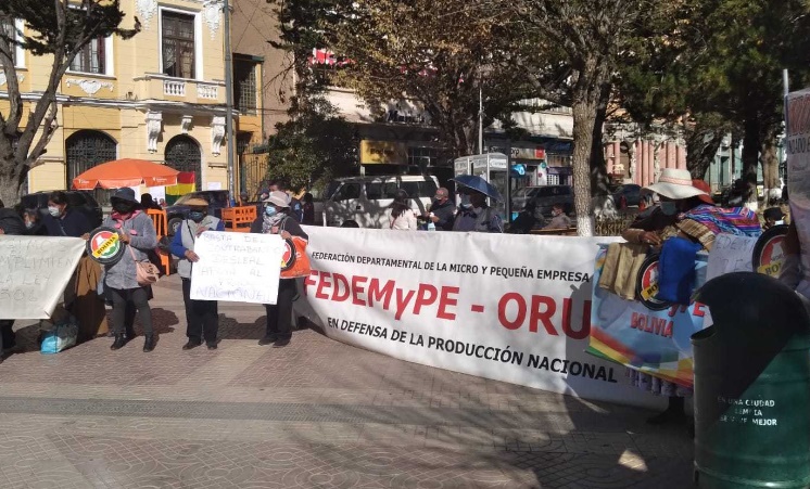La plaza 10 de Febrero fue bloqueada durante toda la mañana del viernes, los protagonistas fueron los microempresarios quienes protestaron en contra del Gobierno Autónomo Municipal de Oruro (GAMO), porque no les dejaban exponer sus productos en la plaza Manuel de Castro y Padilla, interpretando este hecho como una acción en contra de la reactivación económica.