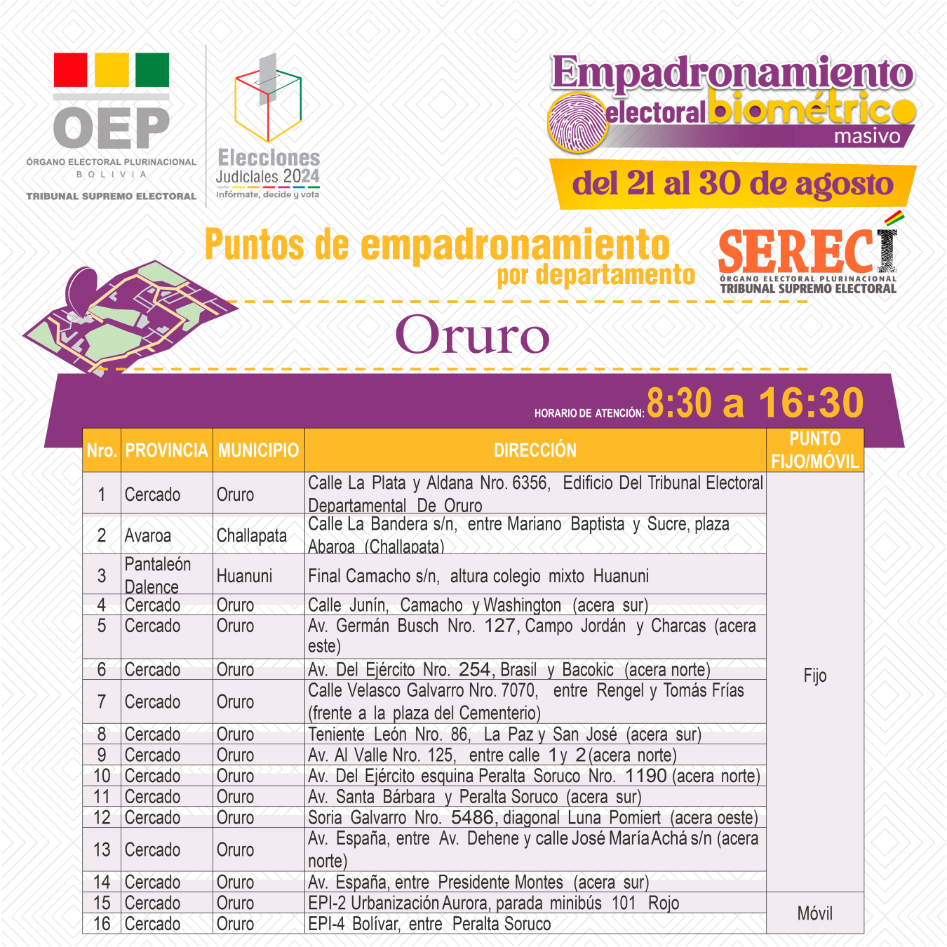 En Oruro, existen siete recintos fijos más el TED de Oruro, donde se atenderá de manera permanente. También habrá brigadas móviles que estarán en diferentes lugares, uno de ellos en la plaza Castro y Padilla. Asimismo, se planificó realizar el empadronamiento en diferentes provincias del departamento de Oruro.