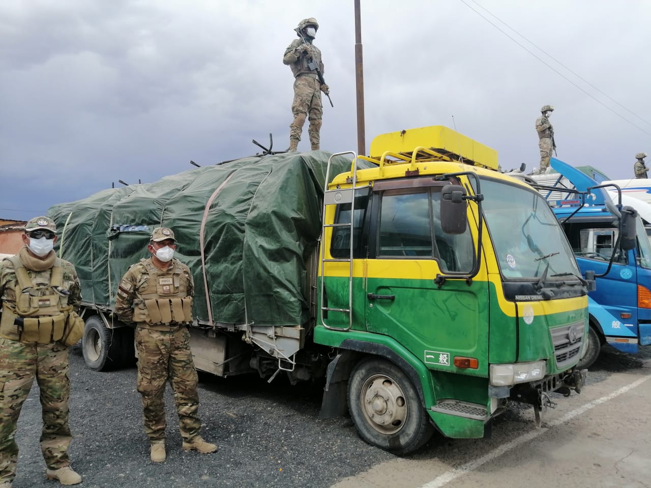 Efectivos de la Patrulla de Reacción Inmediata (PRI) del CEO custodian camiones con contrabando.