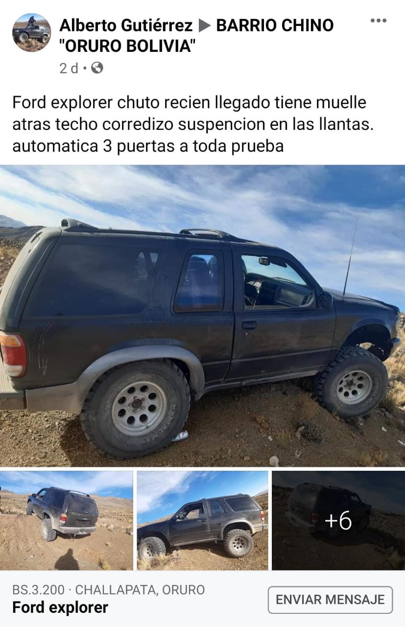 La fotografía de la presente edición muestra una publicación del sábado 26 de junio de esta gestión, realizada por un varón identificado como Alberto Gutiérrez, en la que exhibe fotografías de una vagoneta Ford Explorer de color negro, bajo una descripción de que el motorizado es “chuto” recién llegado, sin dar información de su lugar de origen pero que el mismo se encontraría en el municipio de Challapata del departamento de Oruro.
