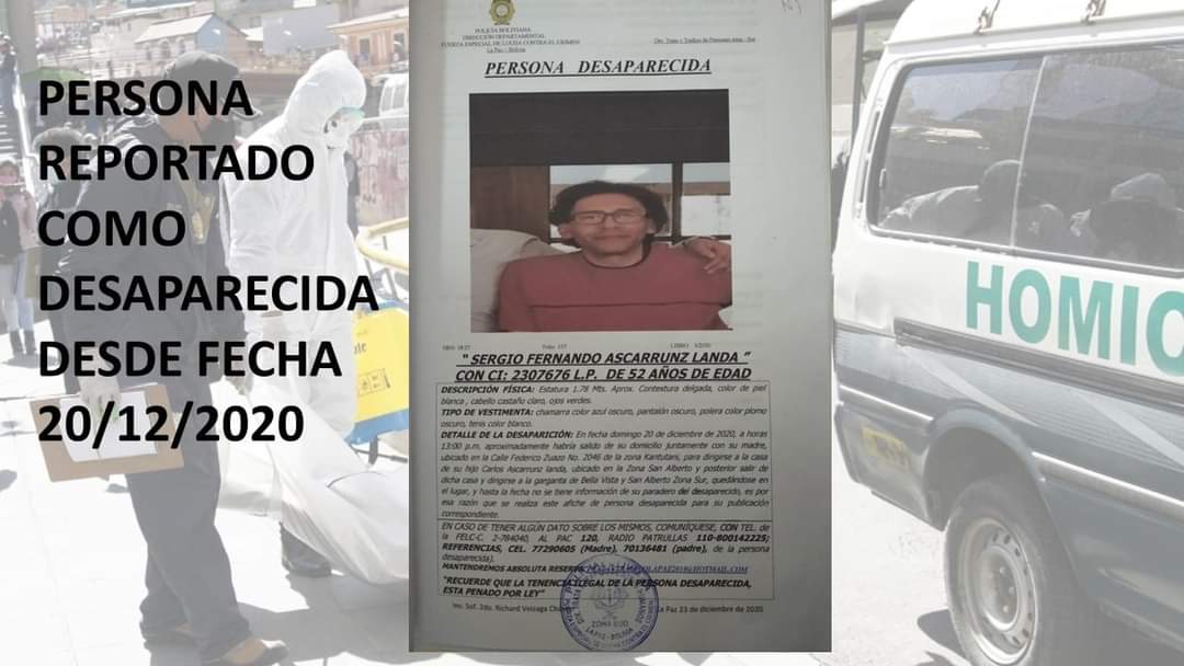De acuerdo a los antecedentes, el 20 de diciembre los familiares de la víctima reportaron a la División Trata y Tráfico de Personal de la FELCC la desaparición de Sergio Fernando Ascarrunz.