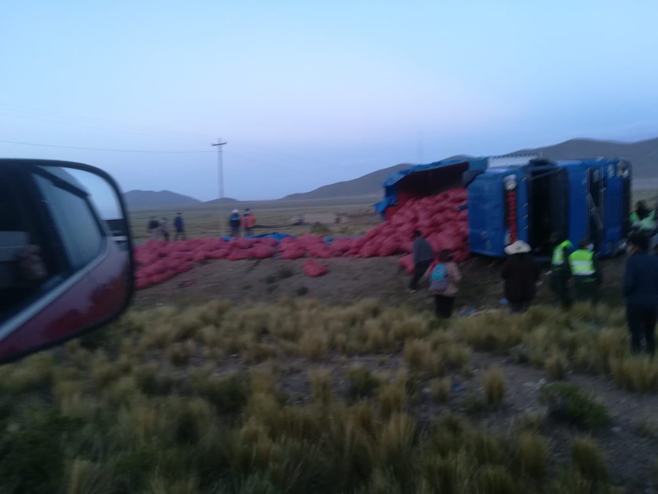 El vuelco de un camión cargado con verduras provocó que por varios minutos el tránsito vehicular fuera interrumpido la madrugada de hoy jueves en la carretera Oruro-Potosí, en cercanías de la población de Poopó.